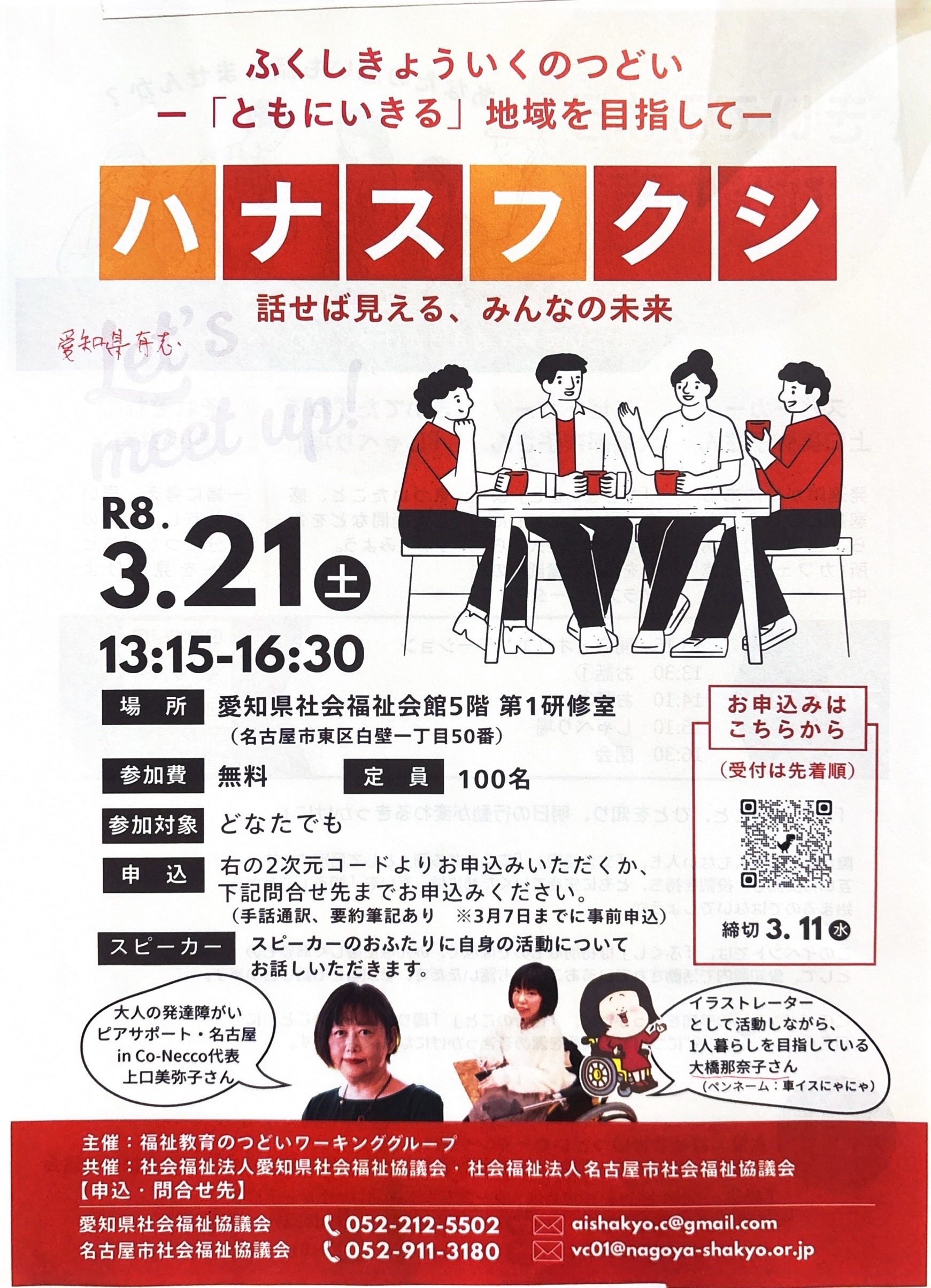 2026年21日㈯、あいち発達障害サポートネットワーク・代表理事の上口美弥子が、愛知県社会福祉会館にて開催された「ハナスフクシ」イベントのスピーカーとして参加しました。