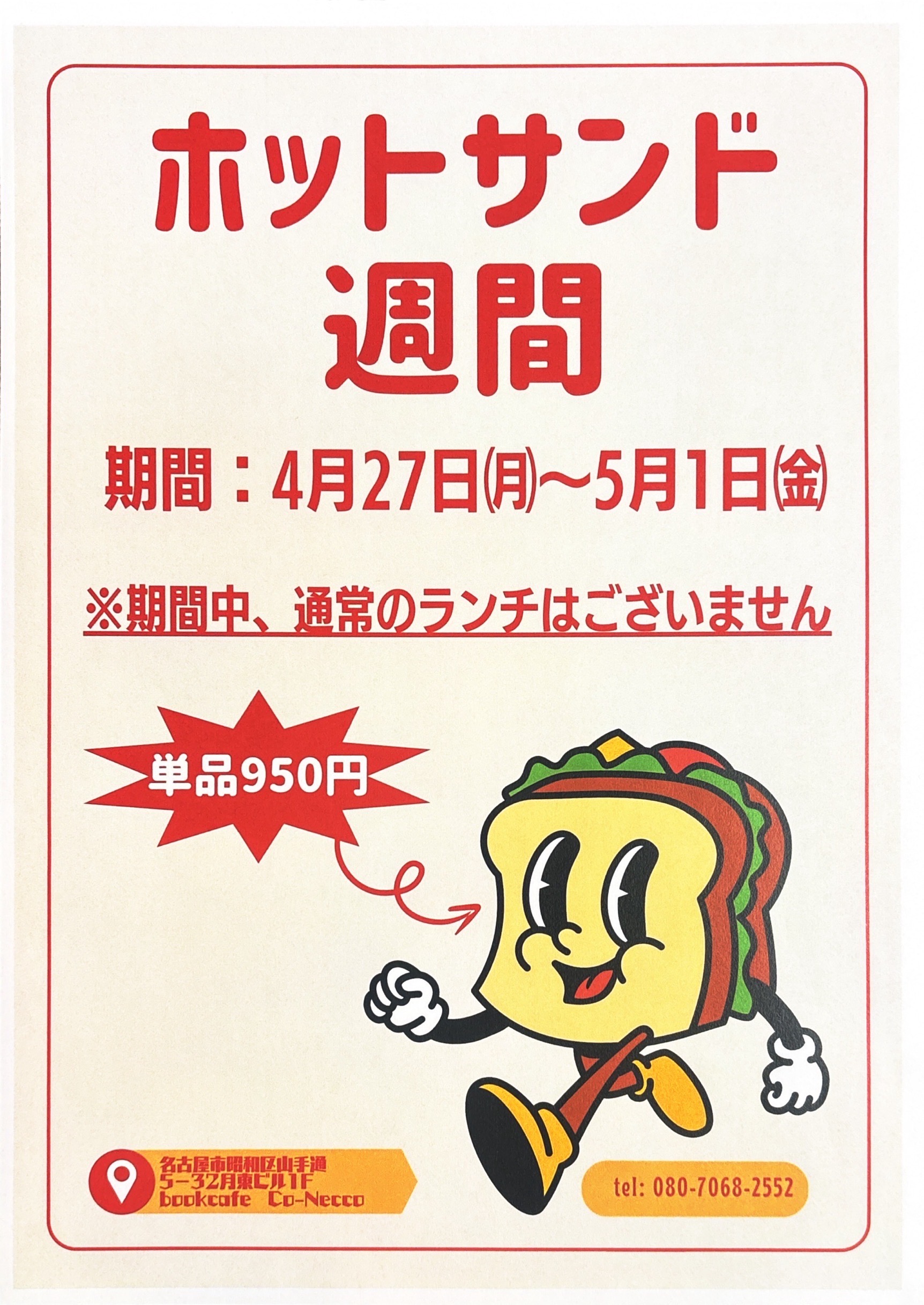 2026年4月27日㈪から2026年5月1日㈮までの期間、ホットサンドを中心としたお食事の提供をさせていただきます。なお、この期間は通常のランチはございません。お気をつけてお越しくださいませ。